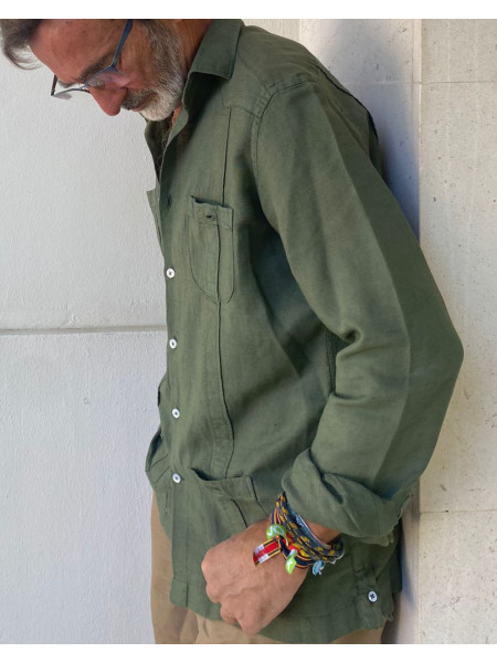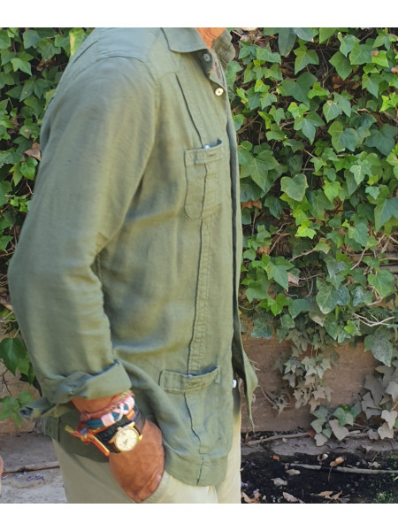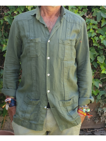 Cubana verde olivo. 50% algodón, 50% lino. Con chinos, parecerás el dueño de una plantación de caña de azúcar en Santiago de Cuba. Con vaqueros, parecerás un chaval. Con bermudas, parecerá que vienes de tu casa de Sotogrande o de Vista Hermosa. Parecerás muchas cosas, pero nunca parecerás un zurdo progre, te lo prometo.